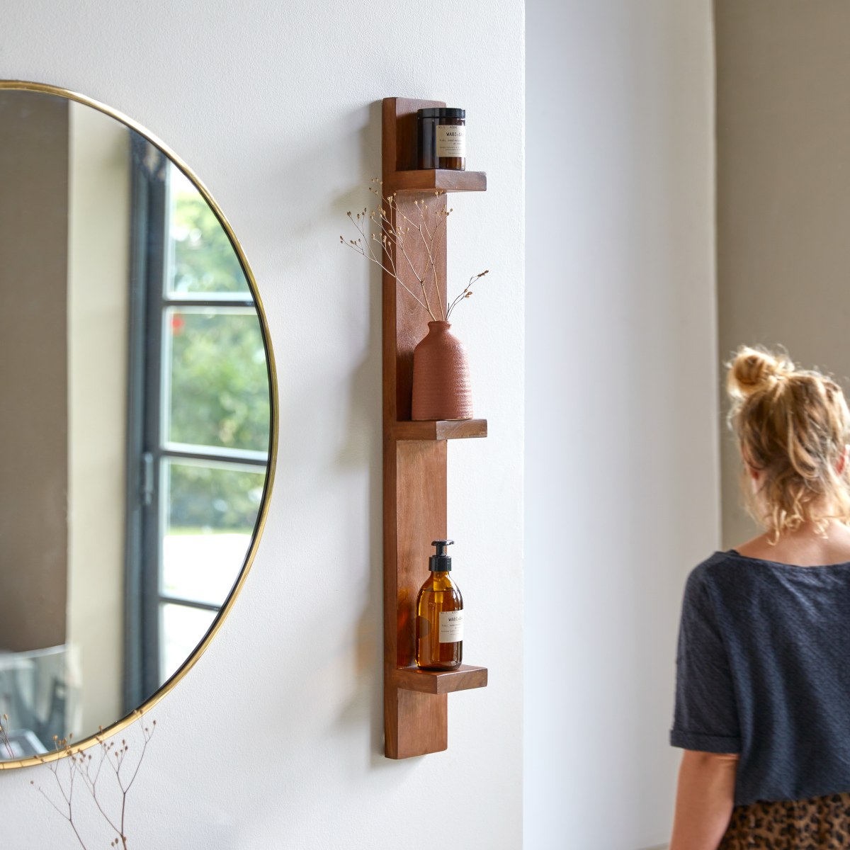Vertical bathroom shelf in solid sheesham wood