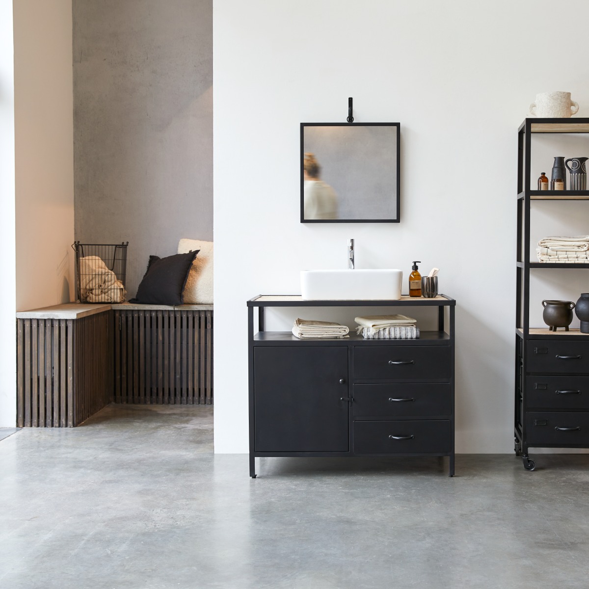 Vanity unit in solid mango wood and metal, 95 cm